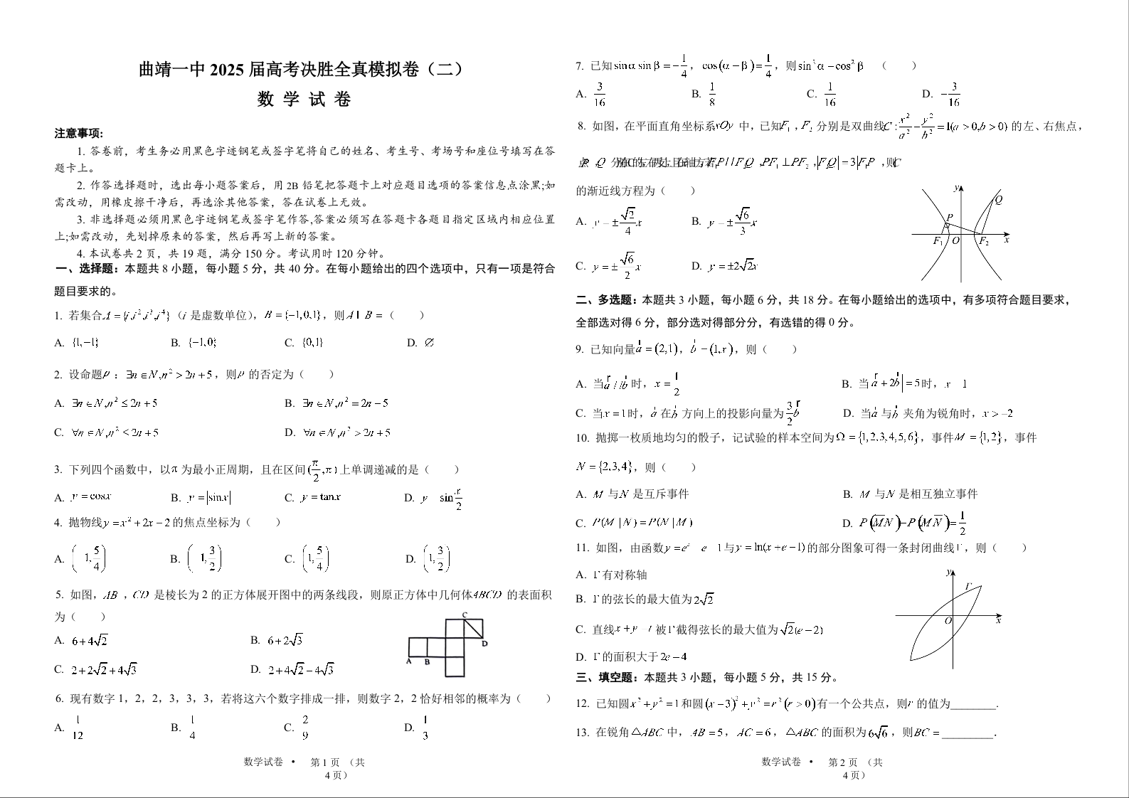 云南省曲靖一中2025届高考决胜全真模拟卷(二)数学