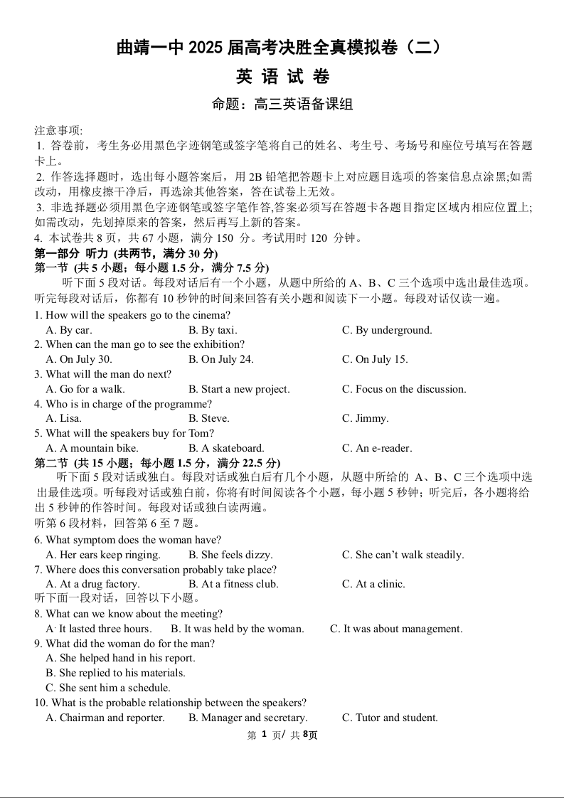 云南省曲靖一中2025届高考决胜全真模拟卷(二)英语