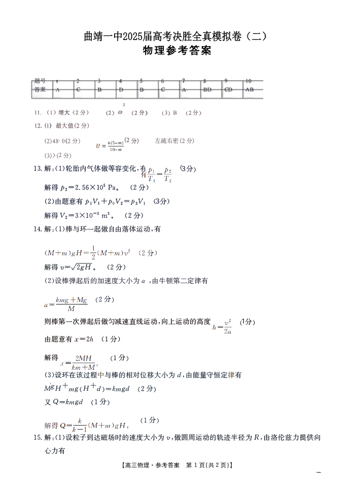 云南省曲靖一中2025届高考决胜全真模拟卷(二)物理答案
