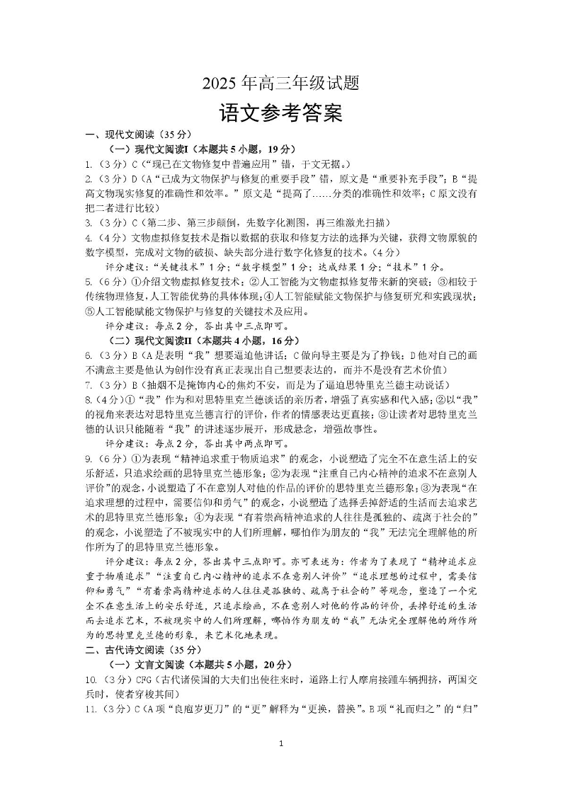 江苏省徐州市2025届下学期5月高三打靶卷语文答案