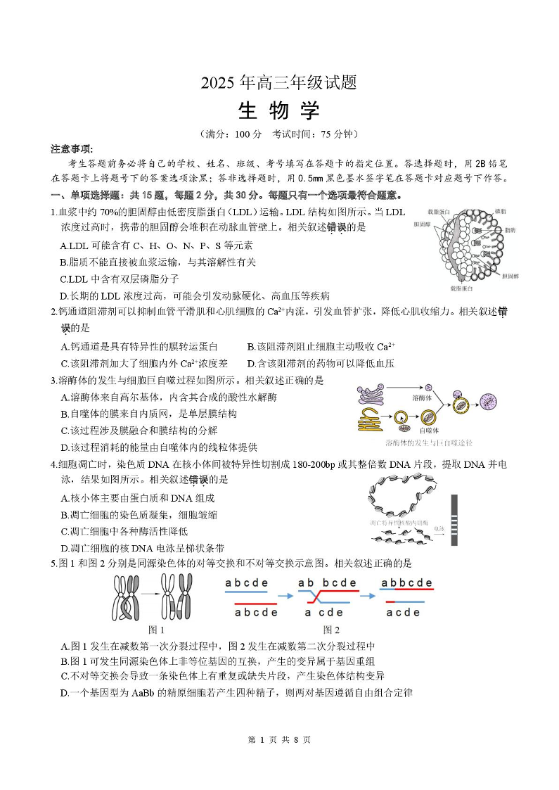 江苏省徐州市2025届下学期5月高三打靶卷生物