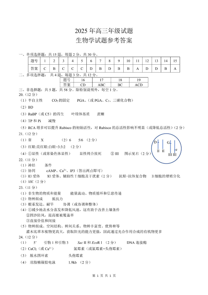 江苏省徐州市2025届下学期5月高三打靶卷生物答案