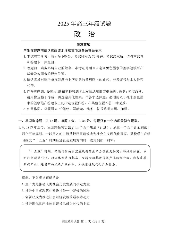 江苏省徐州市2025届下学期5月高三打靶卷政治