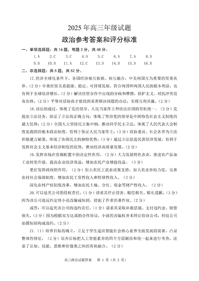 江苏省徐州市2025届下学期5月高三打靶卷政治答案