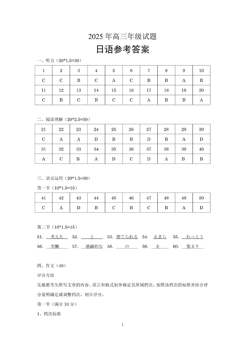 江苏省徐州市2025届下学期5月高三打靶卷日语答案