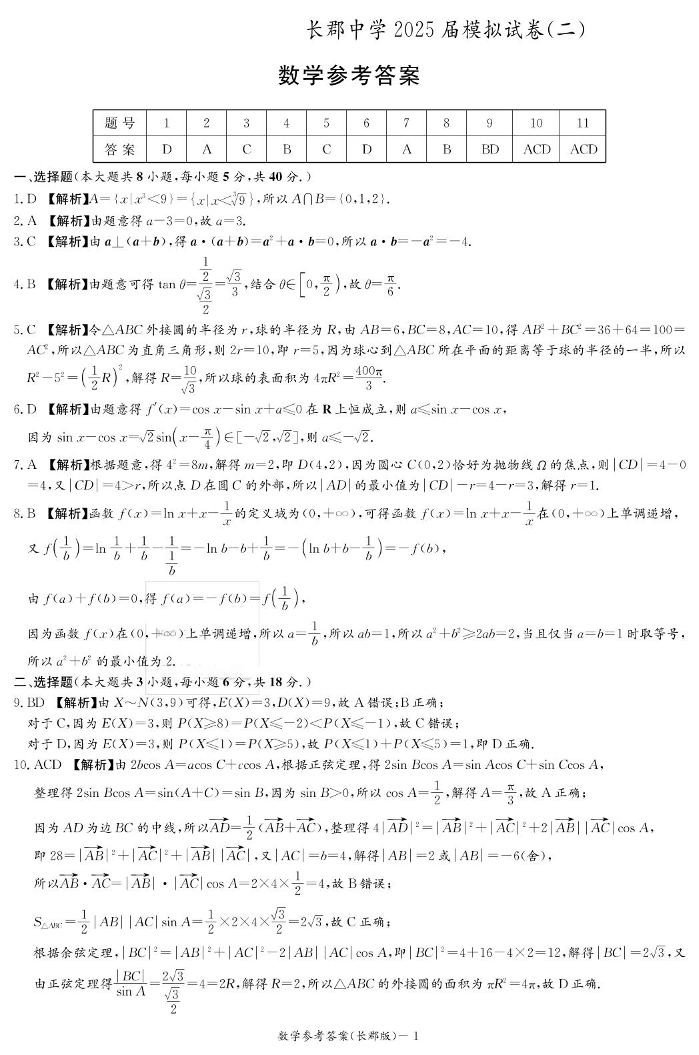 湖南省长郡中学2025届下学期高三考前模拟(二)数学答案