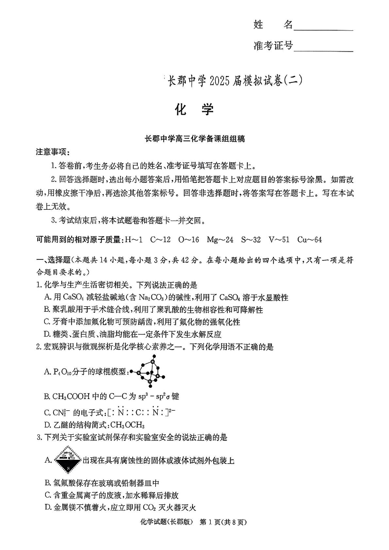湖南省长郡中学2025届下学期高三考前模拟(二)化学
