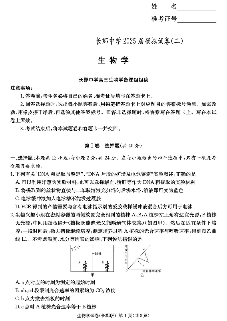 湖南省长郡中学2025届下学期高三考前模拟(二)生物+答案