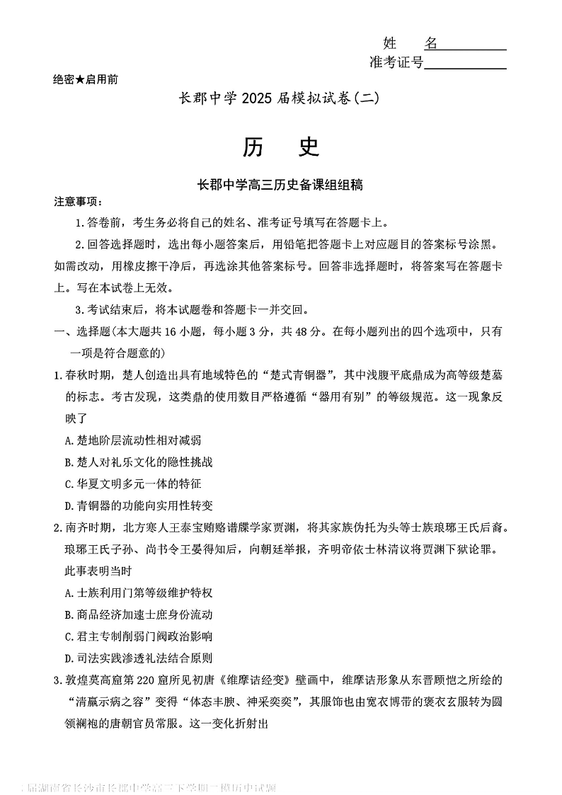 湖南省长郡中学2025届下学期高三考前模拟(二)历史