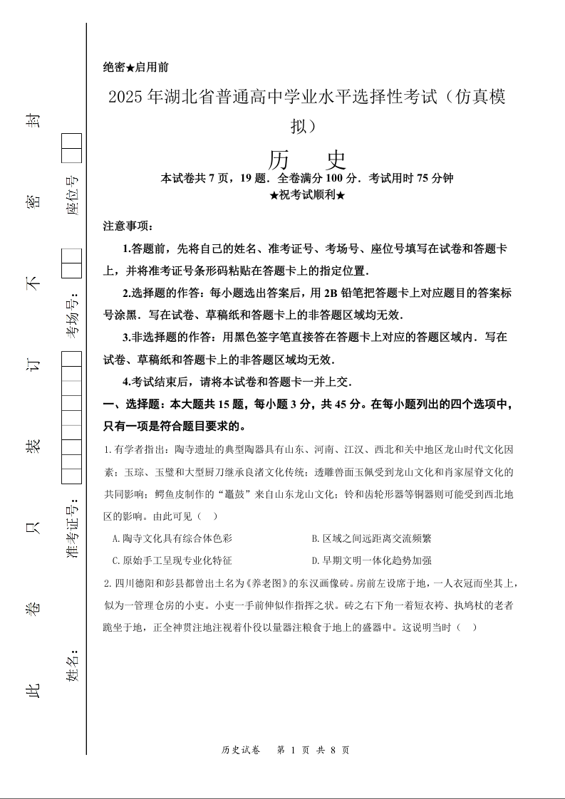 湖北省部分名校2025届高三考前确定卷历史