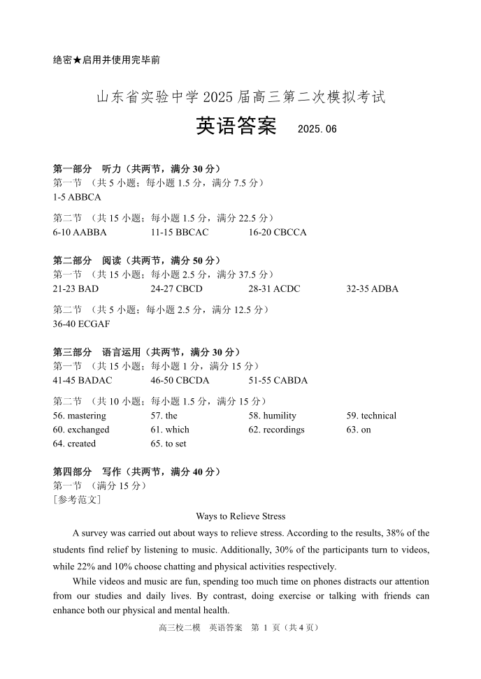 山东省实验中学2025届高三下学期6月二模(押题)英语答案