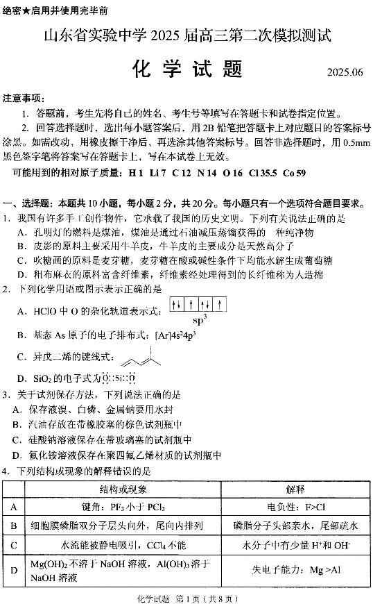 山东省实验中学2025届高三下学期6月二模(押题)化学