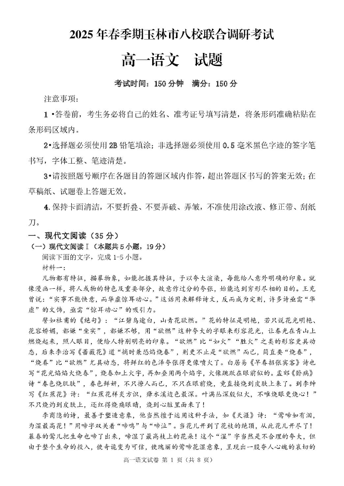 广西玉林市八校2024-2025学年下学期4月高一期中联测语文
