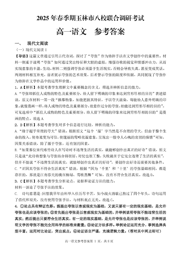 广西玉林市八校2024-2025学年下学期4月高一期中联测语文答案