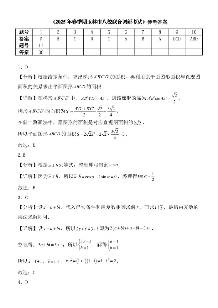 广西玉林市八校2024-2025学年下学期4月高一期中联测数学答案