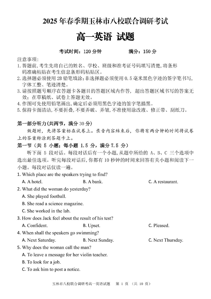 广西玉林市八校2024-2025学年下学期4月高一期中联测英语+答案