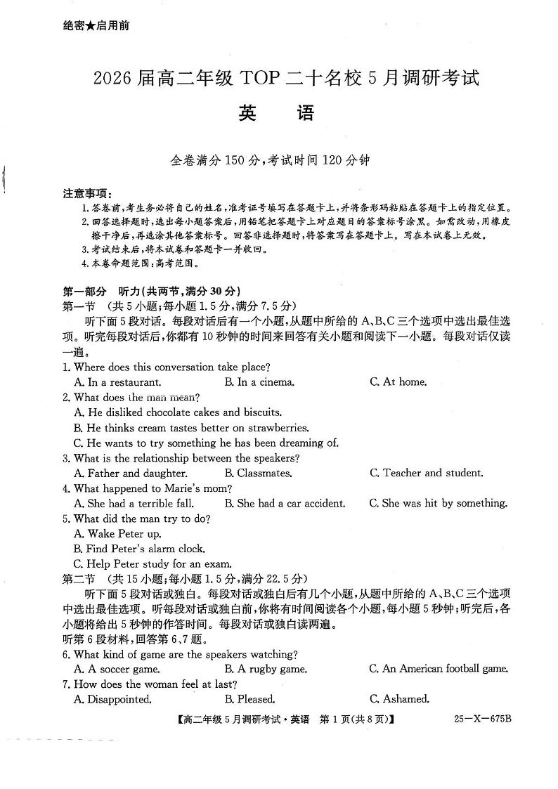 河南省TOP二十名校2024-2025学年下学期5月高二调研考试英语+答案