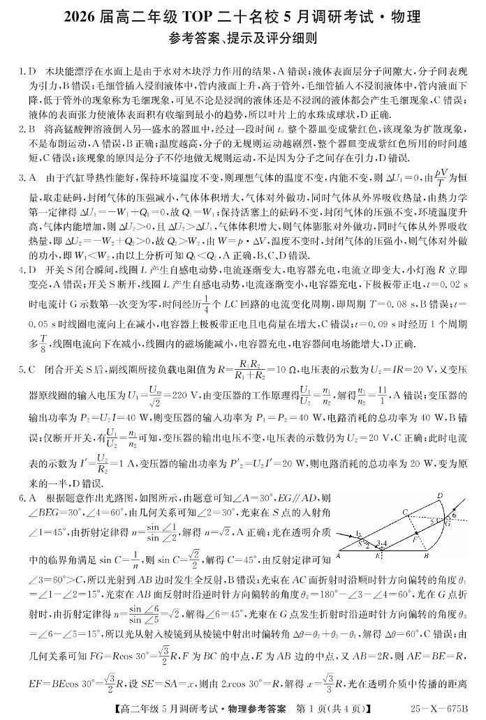 河南省TOP二十名校2024-2025学年下学期5月高二调研考试物理答案
