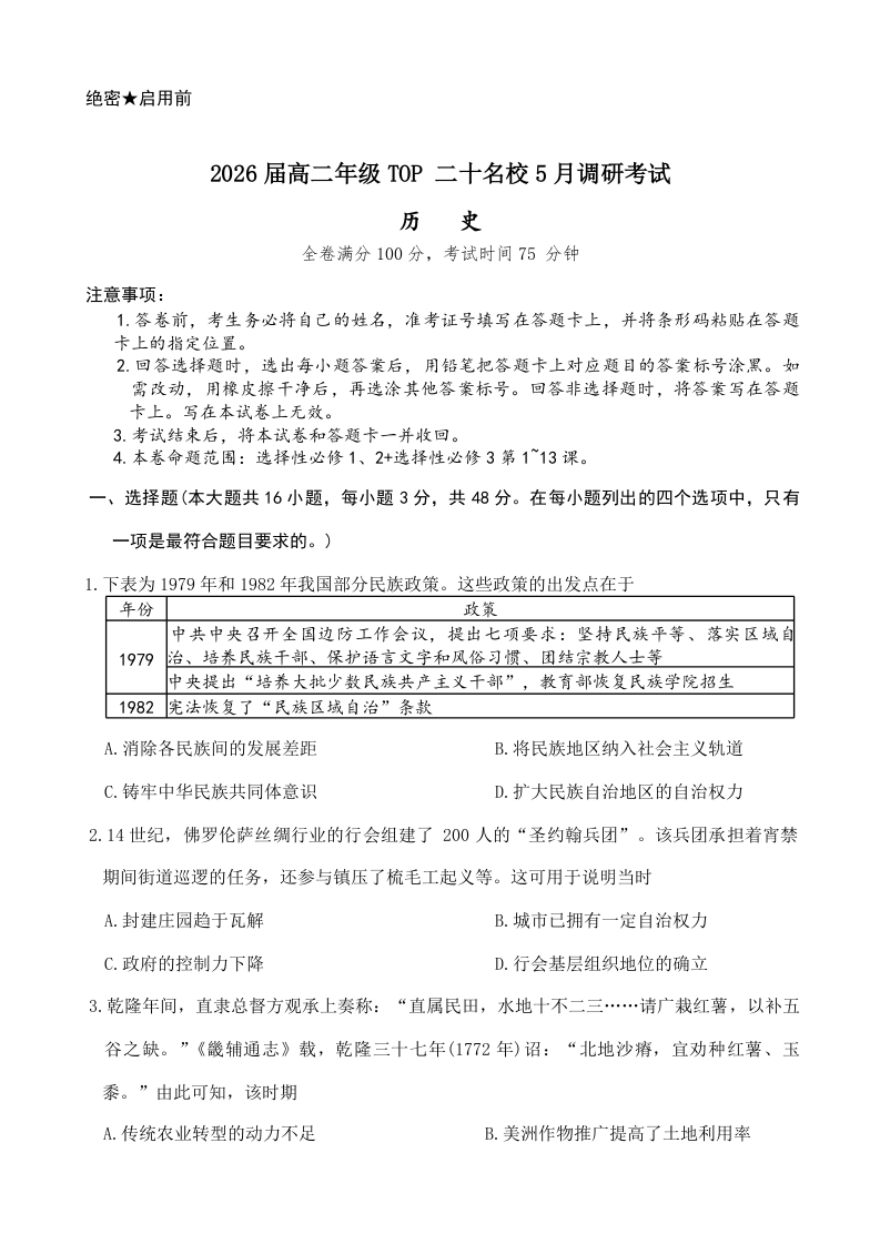 河南省TOP二十名校2024-2025学年下学期5月高二调研考试历史+答案