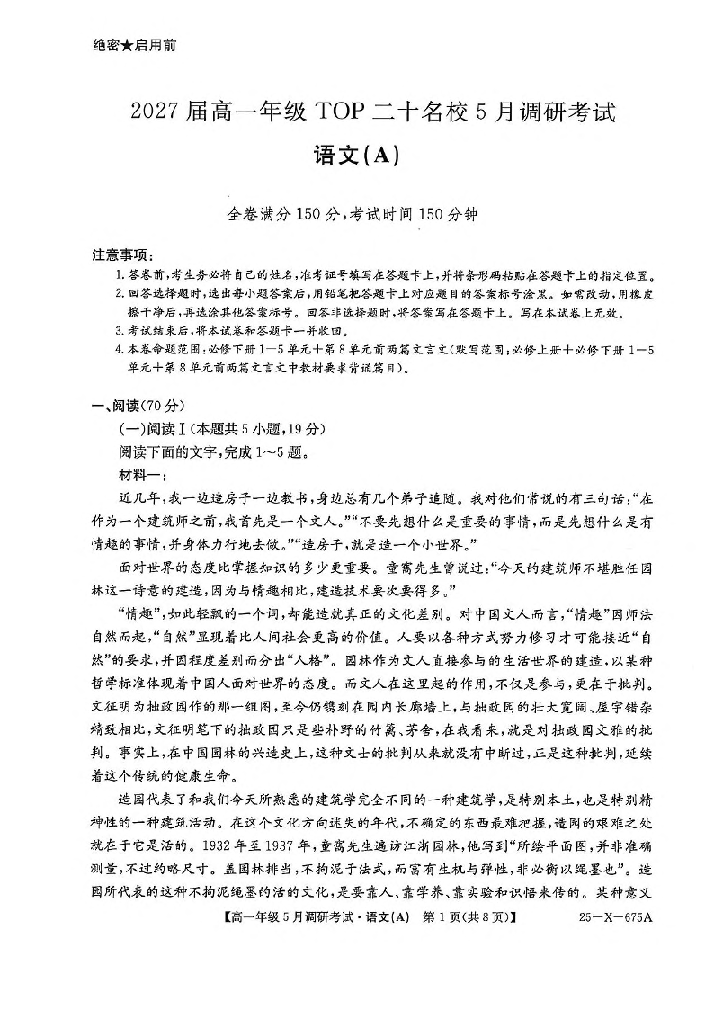 河南省TOP二十名校2024-2025学年下学期5月高一调研考试语文+答案(A卷)