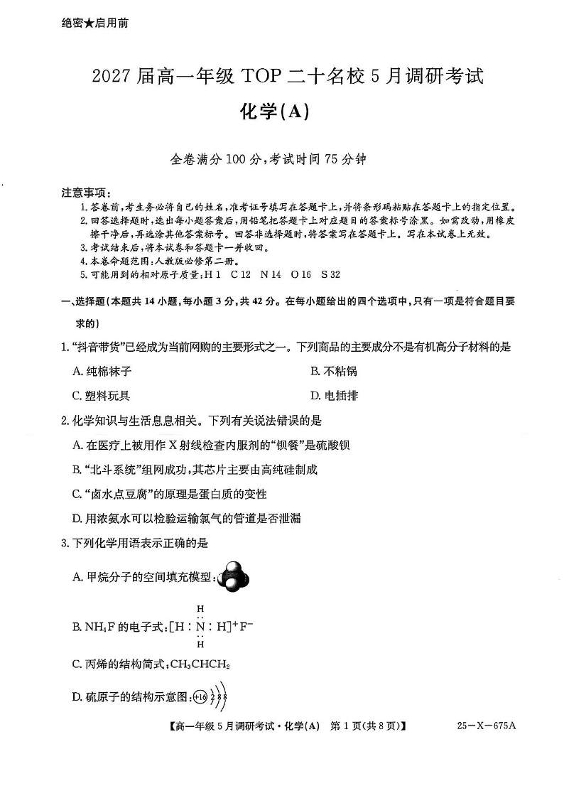 河南省TOP二十名校2024-2025学年下学期5月高一调研考试化学+答案(A卷)