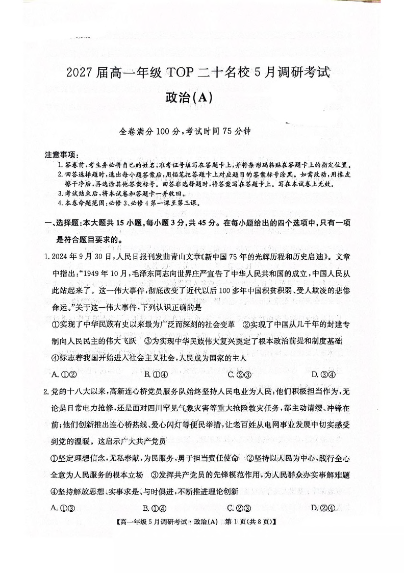 河南省TOP二十名校2024-2025学年下学期5月高一调研考试政治+答案(A卷)