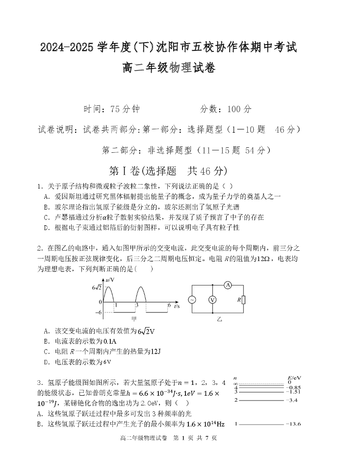 辽宁省沈阳市五校协作体2024-2025学年下学期高二期中考试物理+答案
