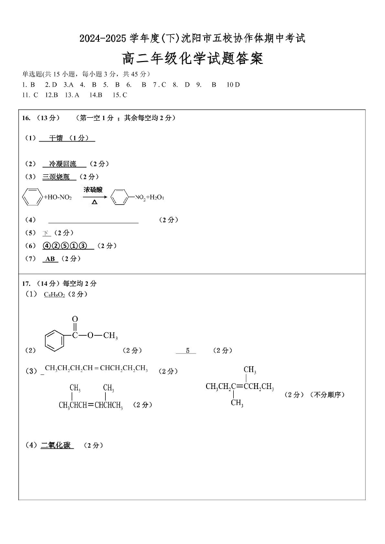 辽宁省沈阳市五校协作体2024-2025学年下学期高二期中考试化学答案