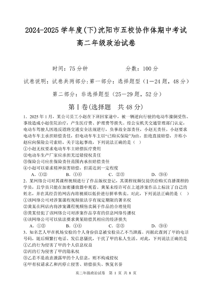 辽宁省沈阳市五校协作体2024-2025学年下学期高二期中考试政治+答案
