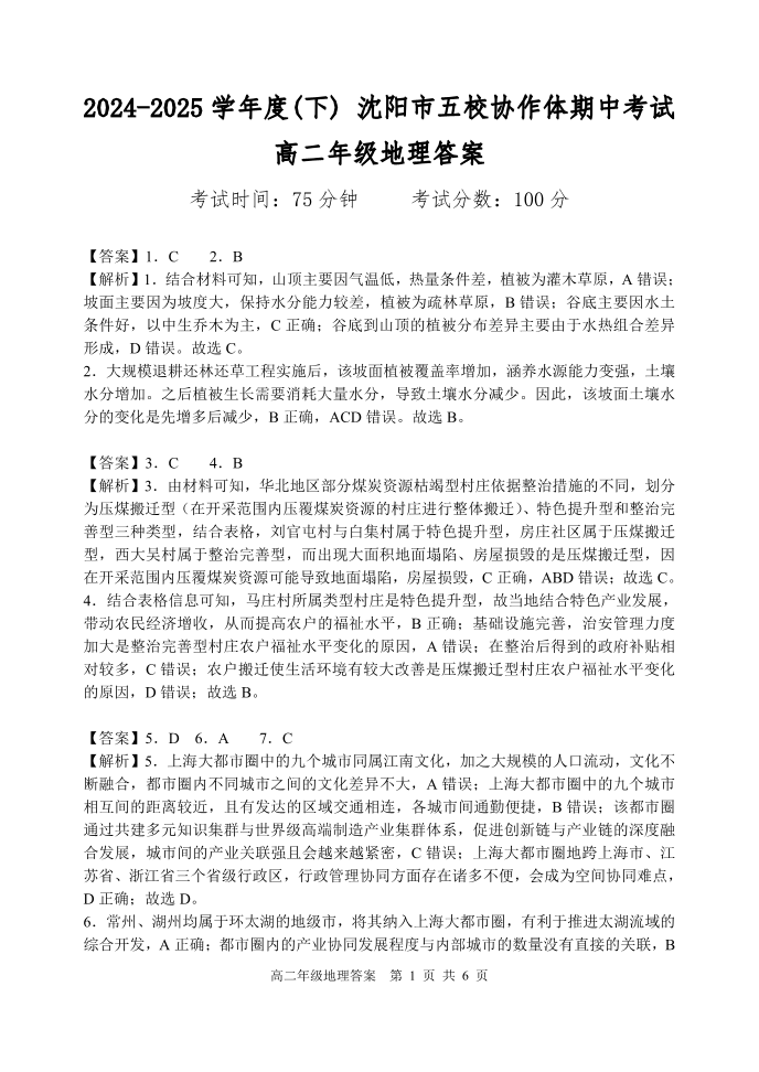 辽宁省沈阳市五校协作体2024-2025学年下学期高二期中考试地理答案