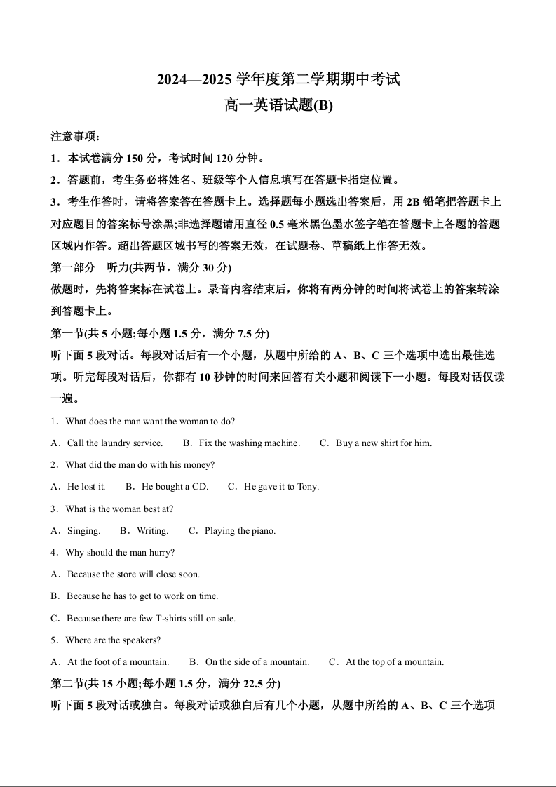 山东省菏泽市2024-2025学年下学期4月高一期中考试英语+答案(B)