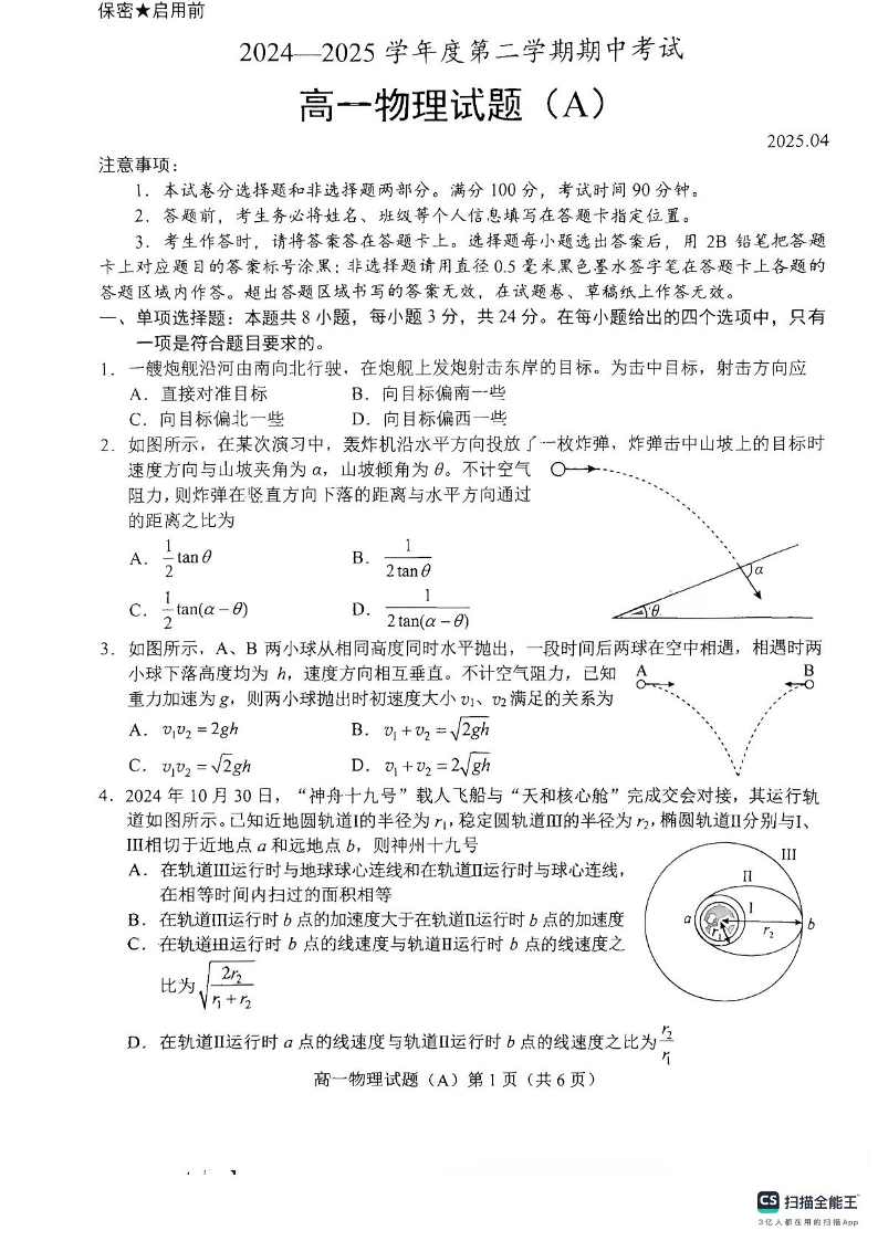 山东省菏泽市2024-2025学年下学期4月高一期中考试物理+答案(A)