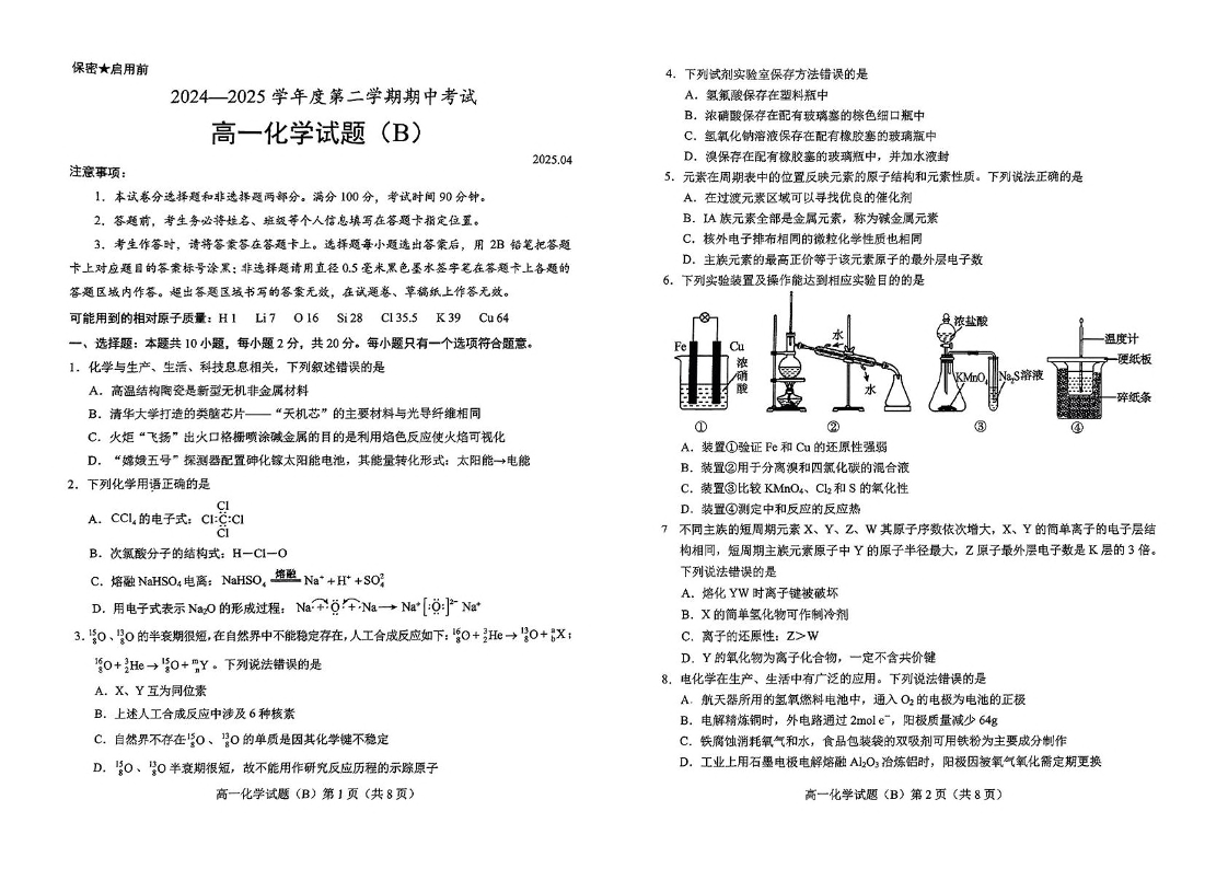 山东省菏泽市2024-2025学年下学期4月高一期中考试化学+答案(B)