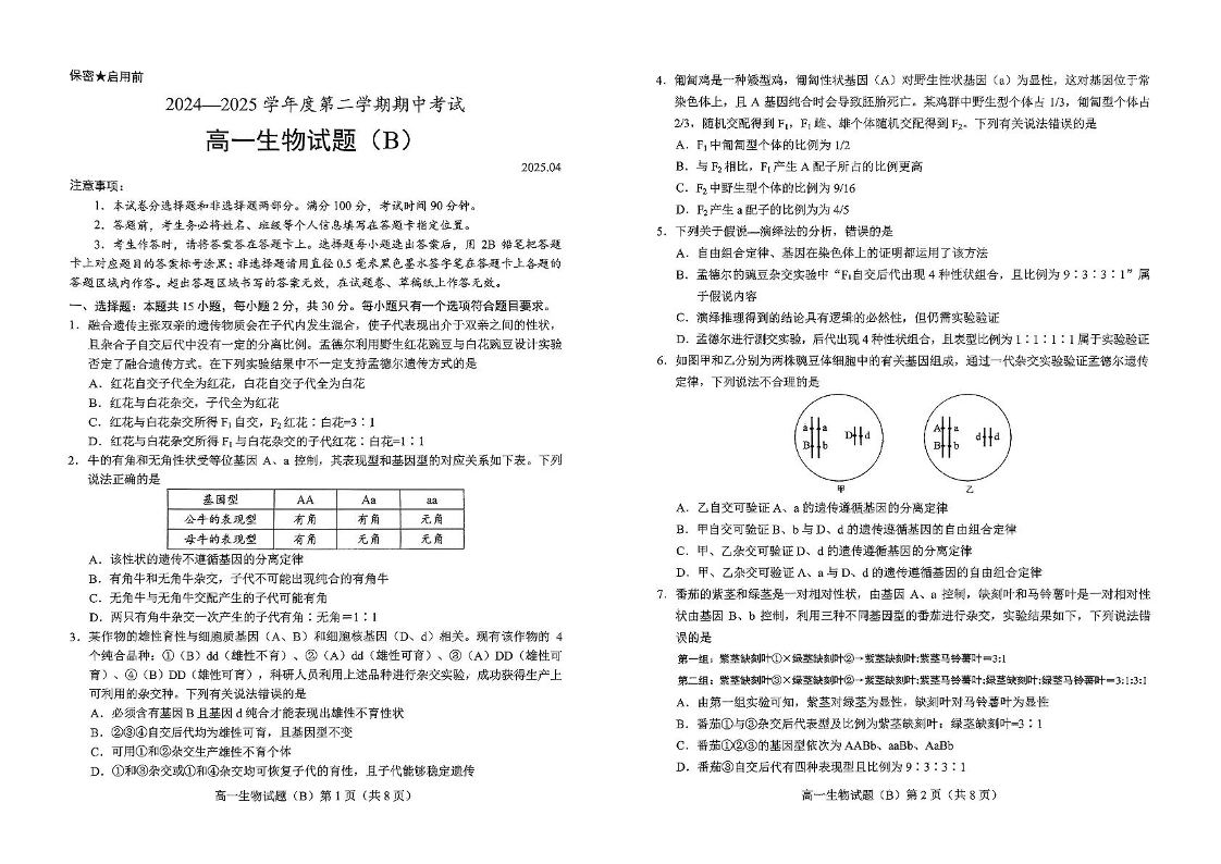 山东省菏泽市2024-2025学年下学期4月高一期中考试生物+答案(B)