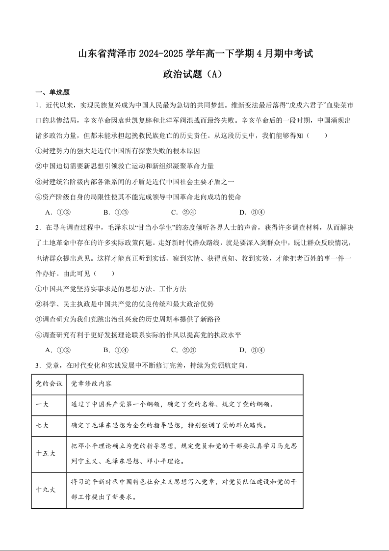 山东省菏泽市2024-2025学年下学期4月高一期中考试政治+答案(A)
