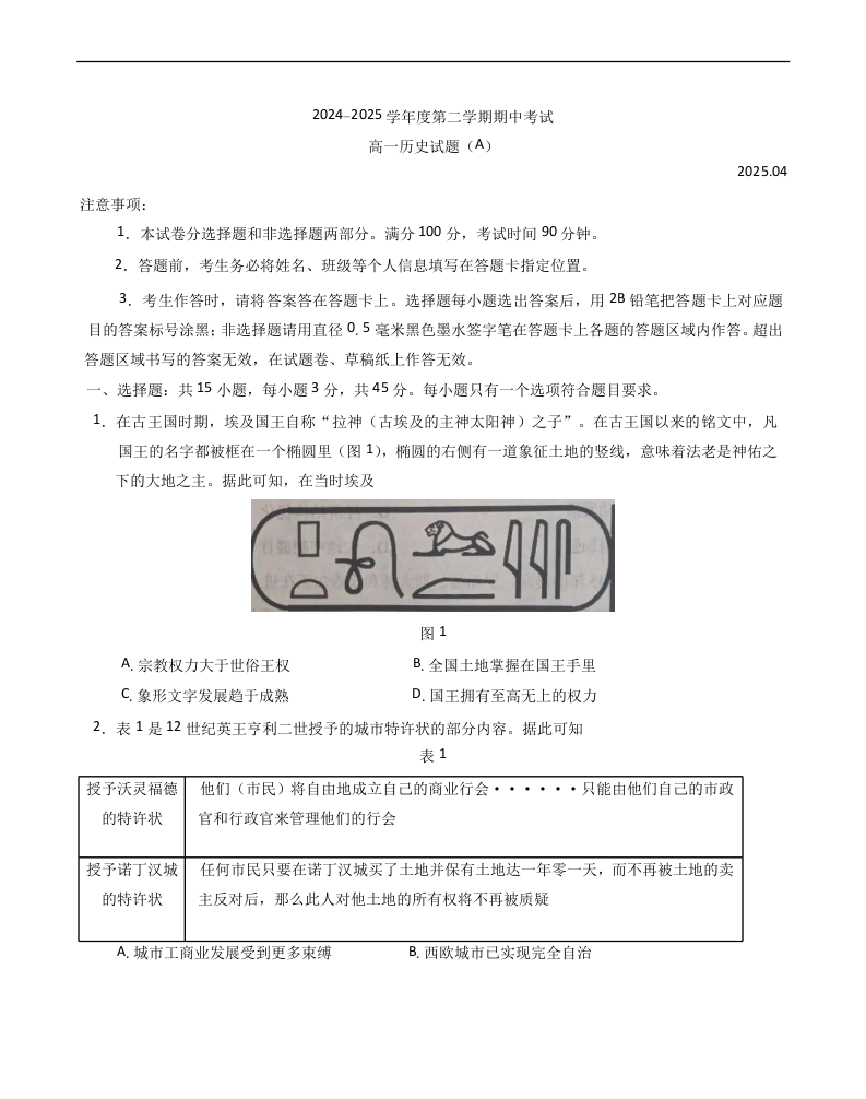 山东省菏泽市2024-2025学年下学期4月高一期中考试历史+答案(A)