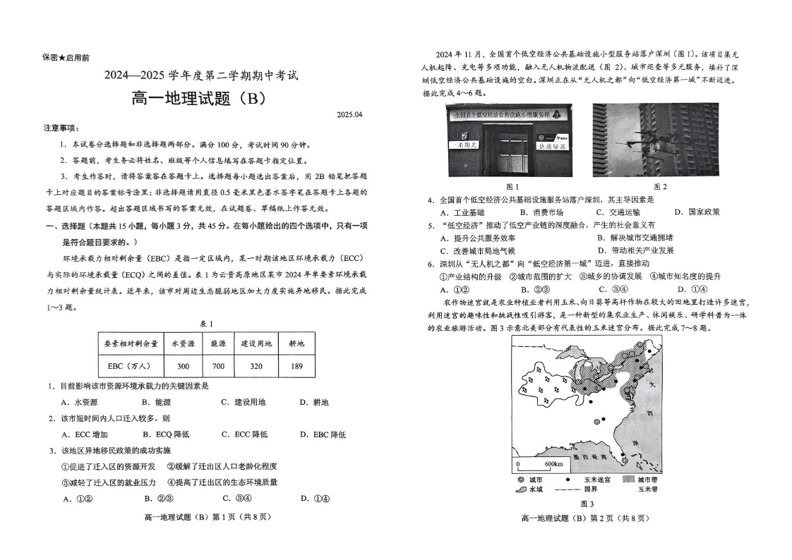 山东省菏泽市2024-2025学年下学期4月高一期中考试地理(B)