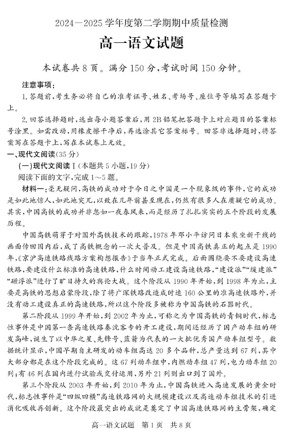 山东省济宁市兖州区2024-2025学年下学期高一期中考试语文