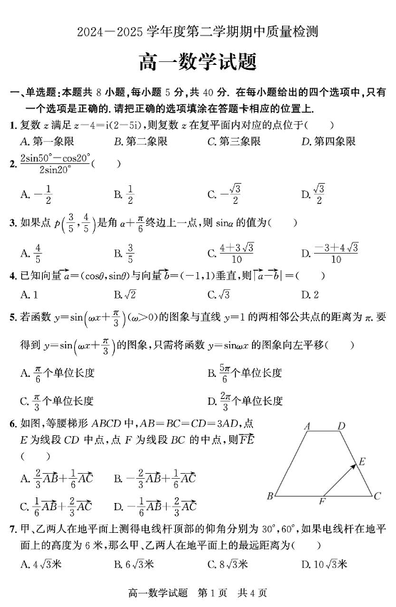 山东省济宁市兖州区2024-2025学年下学期高一期中考试数学