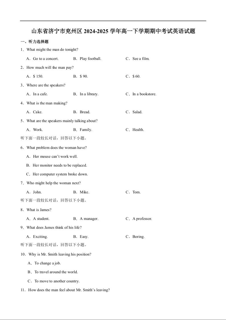 山东省济宁市兖州区2024-2025学年下学期高一期中考试英语+答案