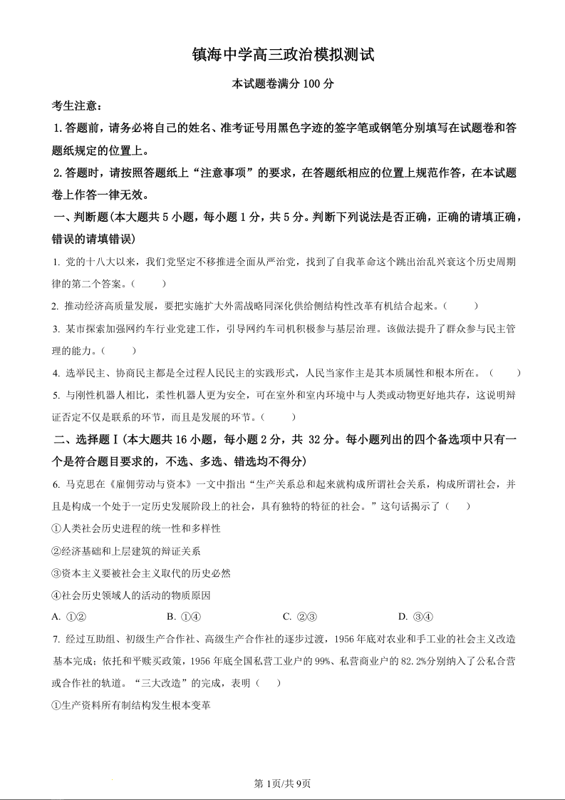 浙江省宁波市镇海中学2024届高三12月首考模拟政治(原卷版)
