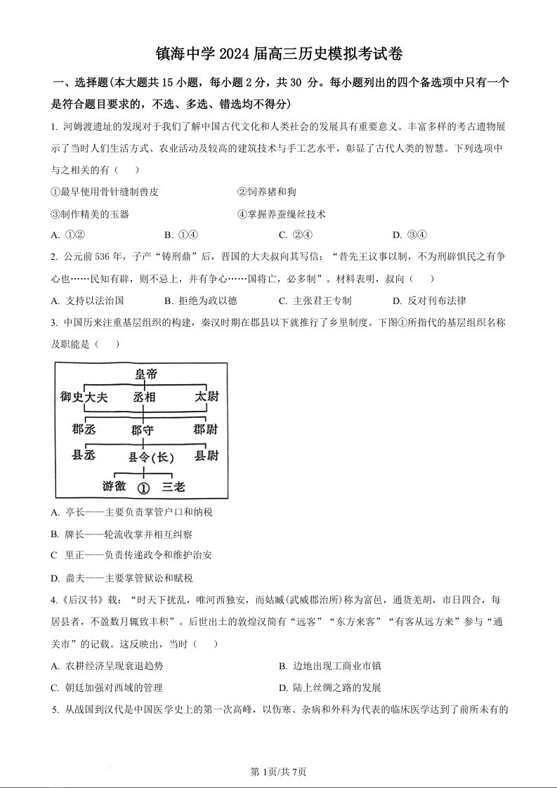 浙江省宁波市镇海中学2024届高三12月首考模拟历史(原卷版)