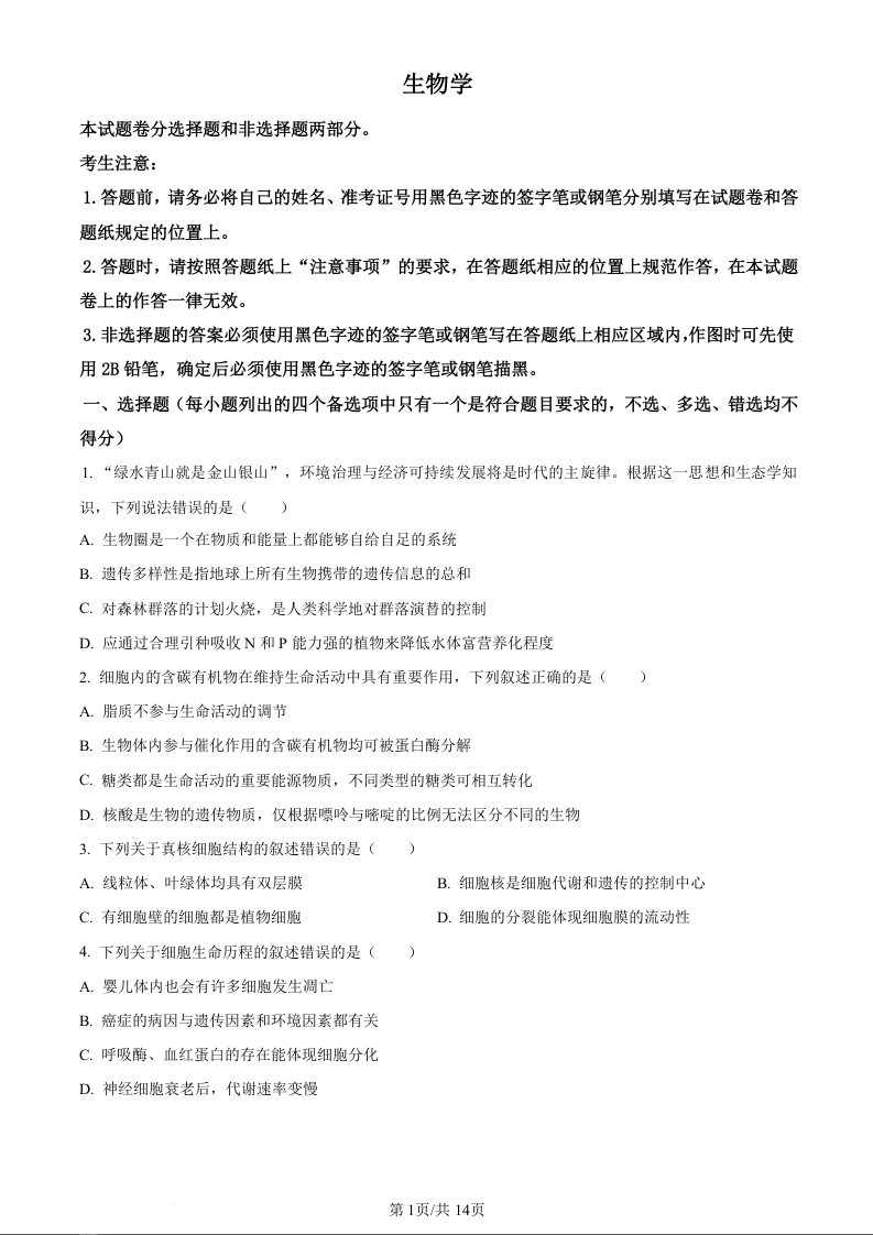 浙江省宁波市镇海中学2024届高三12月首考模拟生物(原卷版)