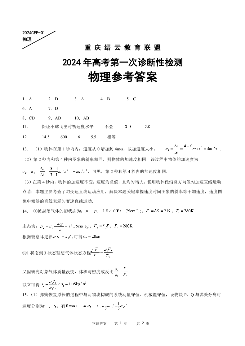 重庆缙云教育联盟2024届高三高考第一次诊断性检测(一模)物理答案