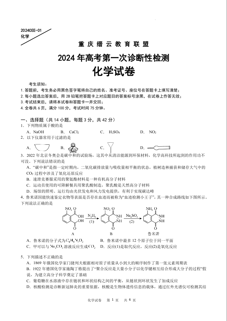 重庆缙云教育联盟2024届高三高考第一次诊断性检测(一模)化学