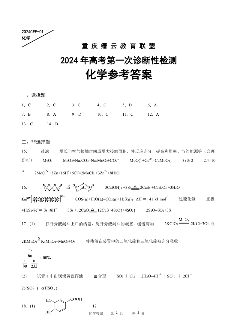 重庆缙云教育联盟2024届高三高考第一次诊断性检测(一模)化学答案
