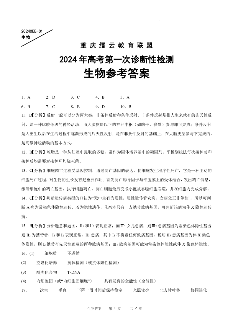 重庆缙云教育联盟2024届高三高考第一次诊断性检测(一模)生物答案