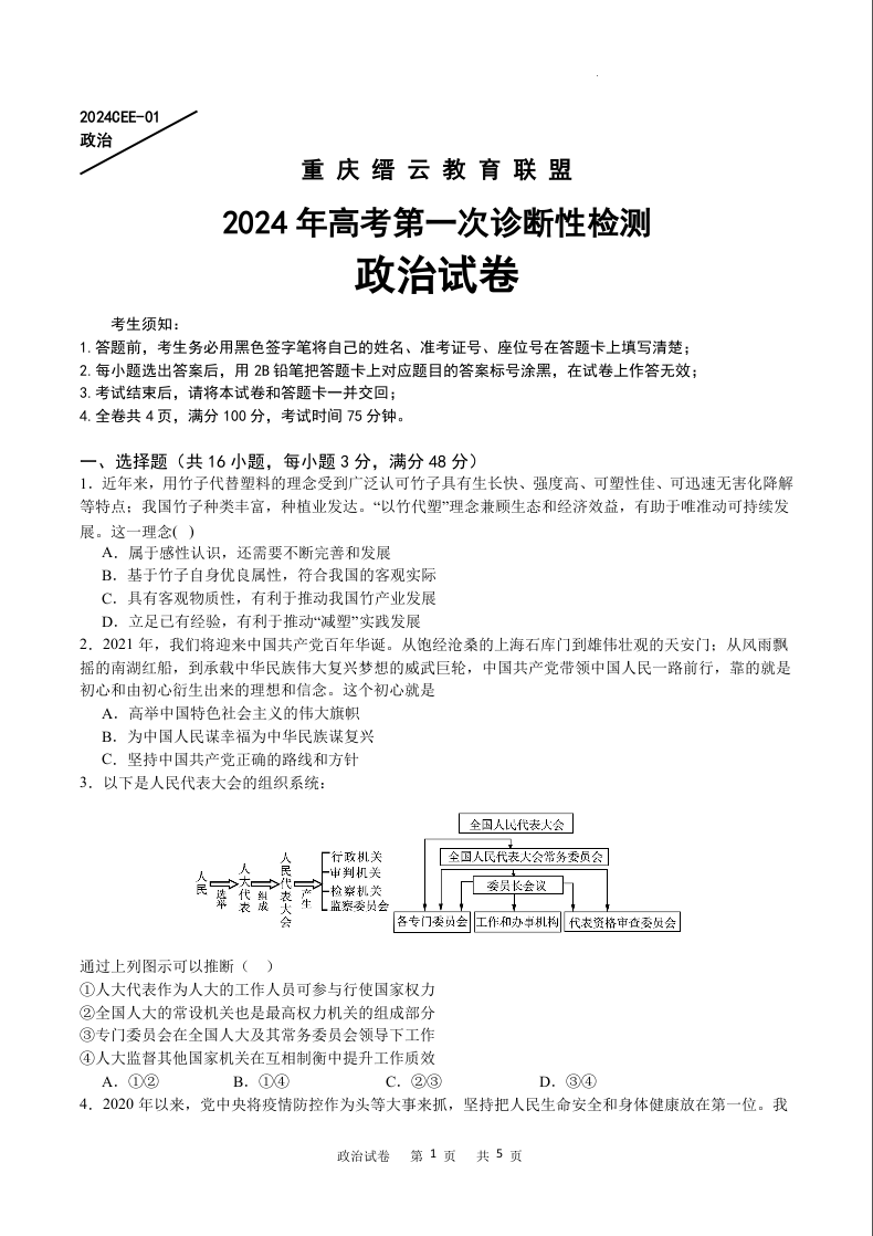 重庆缙云教育联盟2024届高三高考第一次诊断性检测(一模)政治
