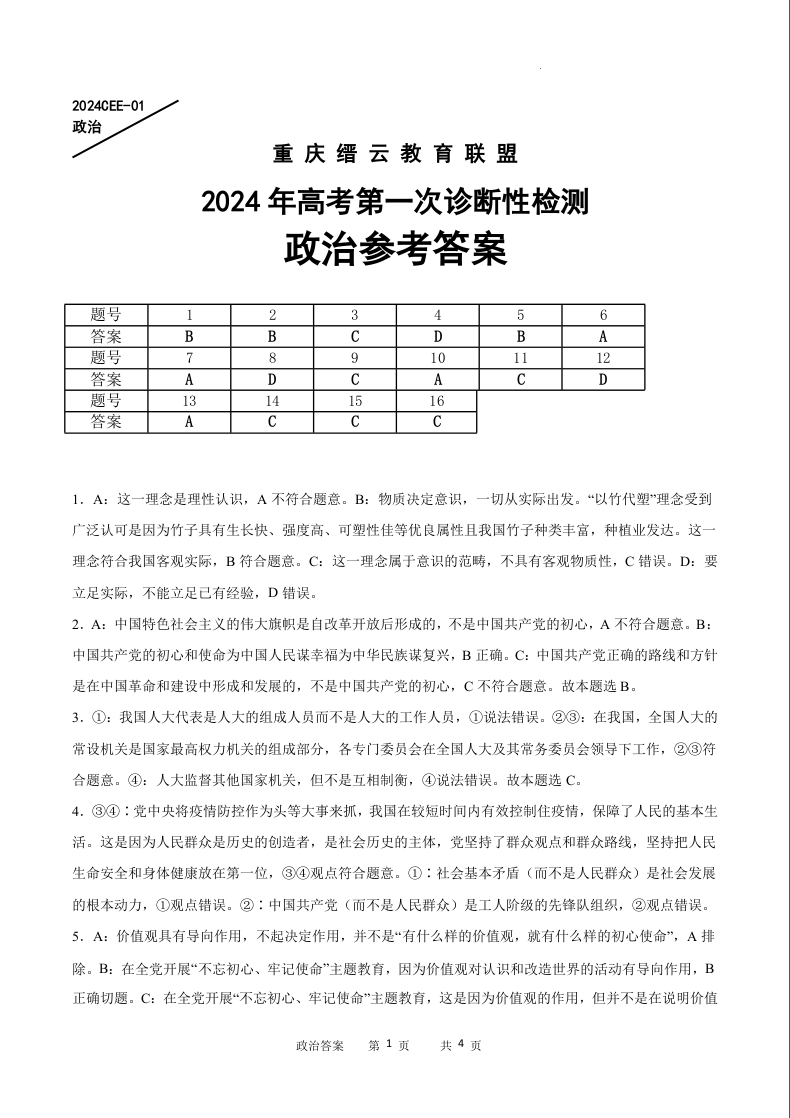 重庆缙云教育联盟2024届高三高考第一次诊断性检测(一模)政治答案