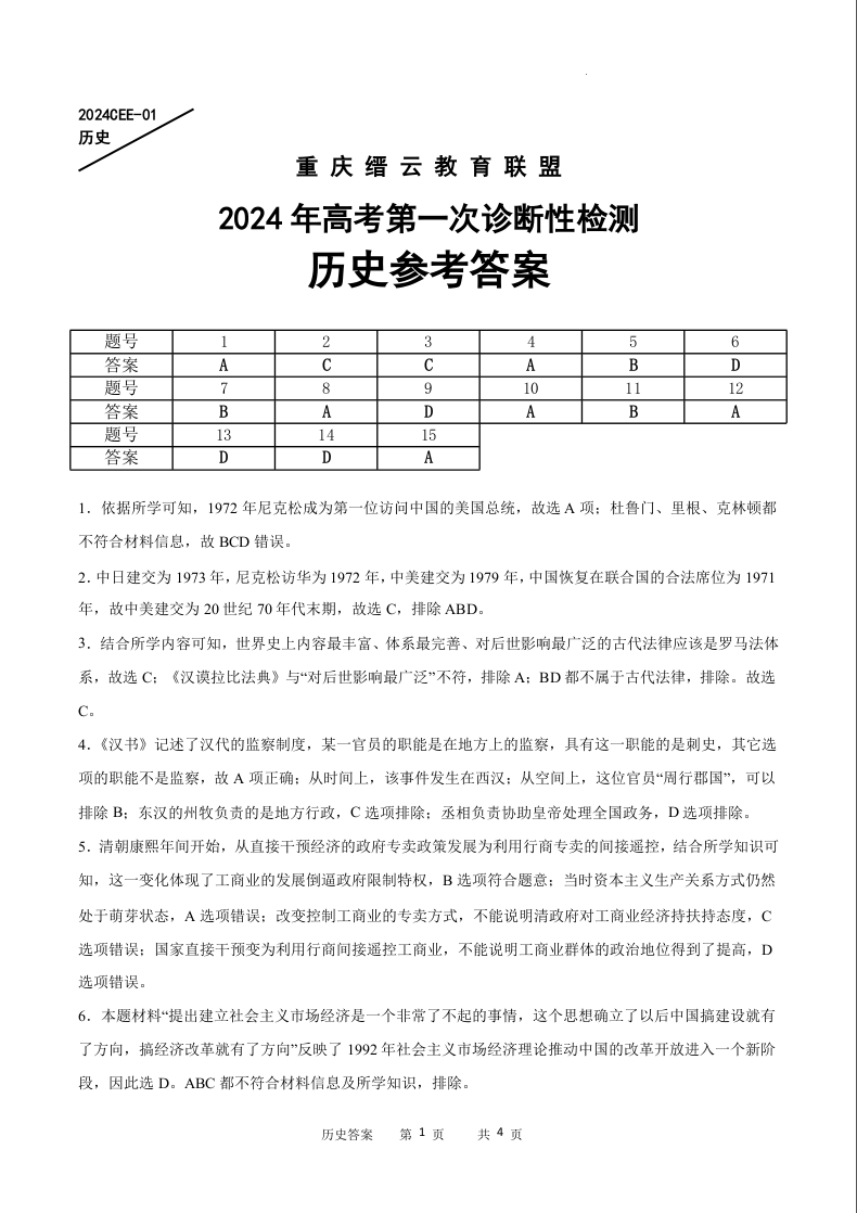重庆缙云教育联盟2024届高三高考第一次诊断性检测(一模)历史答案